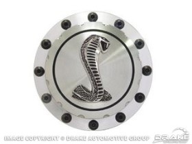 64-73 Billet Fuel Cap (Cobra Emblem)The perfect finishing touch for your "Resto-Mod". Machined from a solid block of billet aluminum. Features our black button head screws and our quality internal components. Security cable included to deter theft. Available with several types of emblems and also in black anodized. Will not fit 1970 cars with California emmissions.